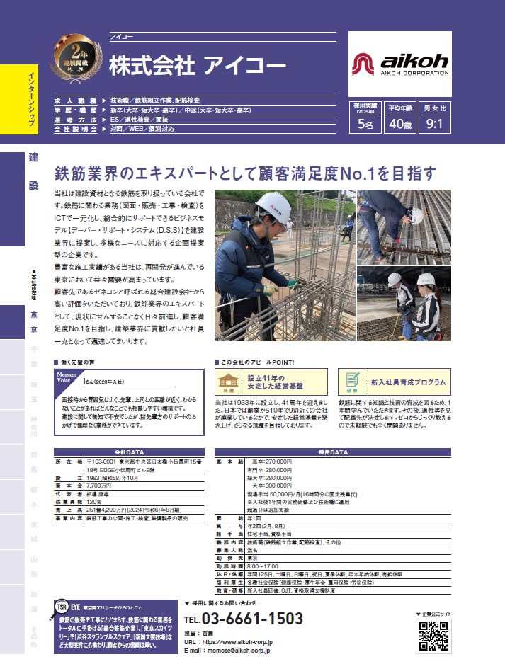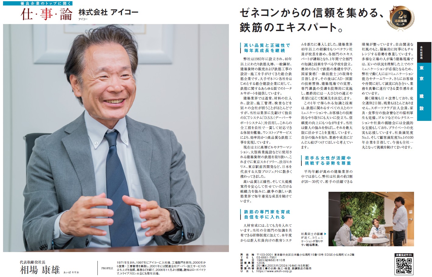 優良企業紹介誌「ALevel(エラベル) 2027」に2年連続で掲載されました2025年11月5日Tweet 東京商工リサーチ社が発行する優良企業紹介誌「ALevel(エラベル) 2026」に弊社が掲載されました。 「ALevel(エラベル)」は、東京商工リサーチ社が発行する企業情報誌で、「Aレベルの会社を“選べる”」というコンセプトで、高評点企業のみ掲載できる地域密着の優良企業紹介誌です。 「経営者能力」「成長性」「安定性」「公開性・総合世評」の4項目から「TSR評点」を総合的に算出され、「ALEVEL」では「TSR評点」にて一定の評価を得たAランク企業(※全国の企業の上位8%の優良企業)が紹介されています。 弊社のページは以下のURLよりご覧ください。 https://www.alevelsearch.com/company/aikoh-corp/